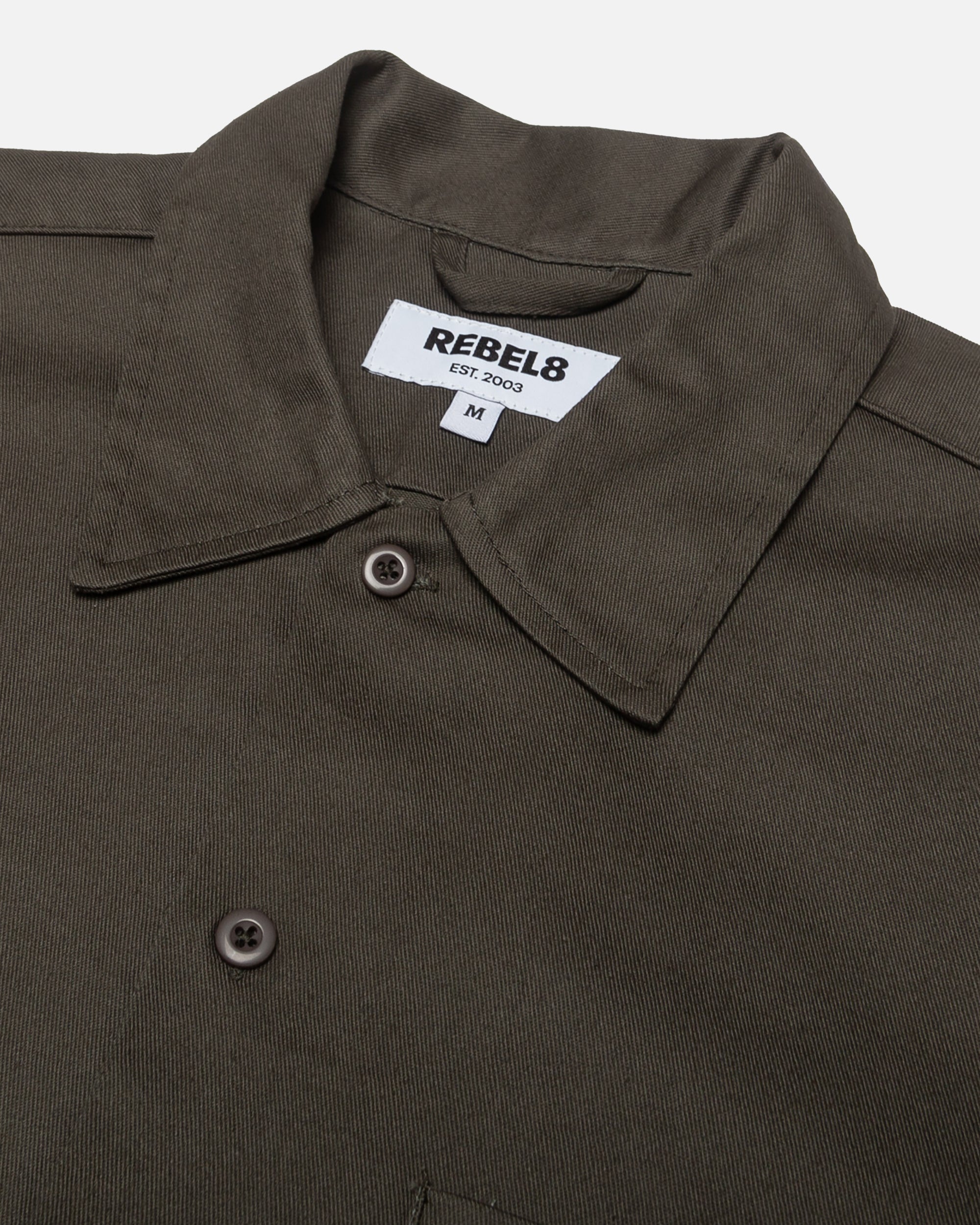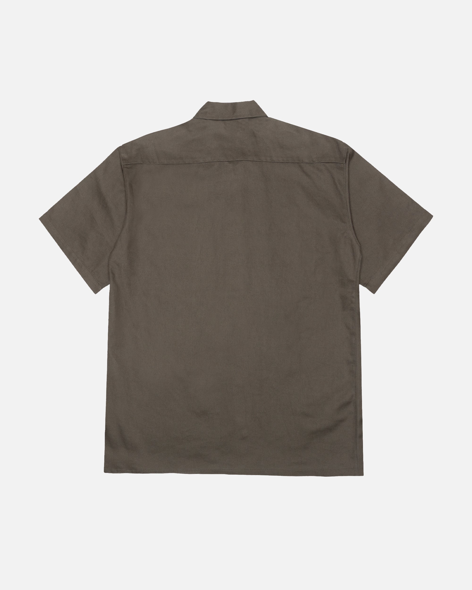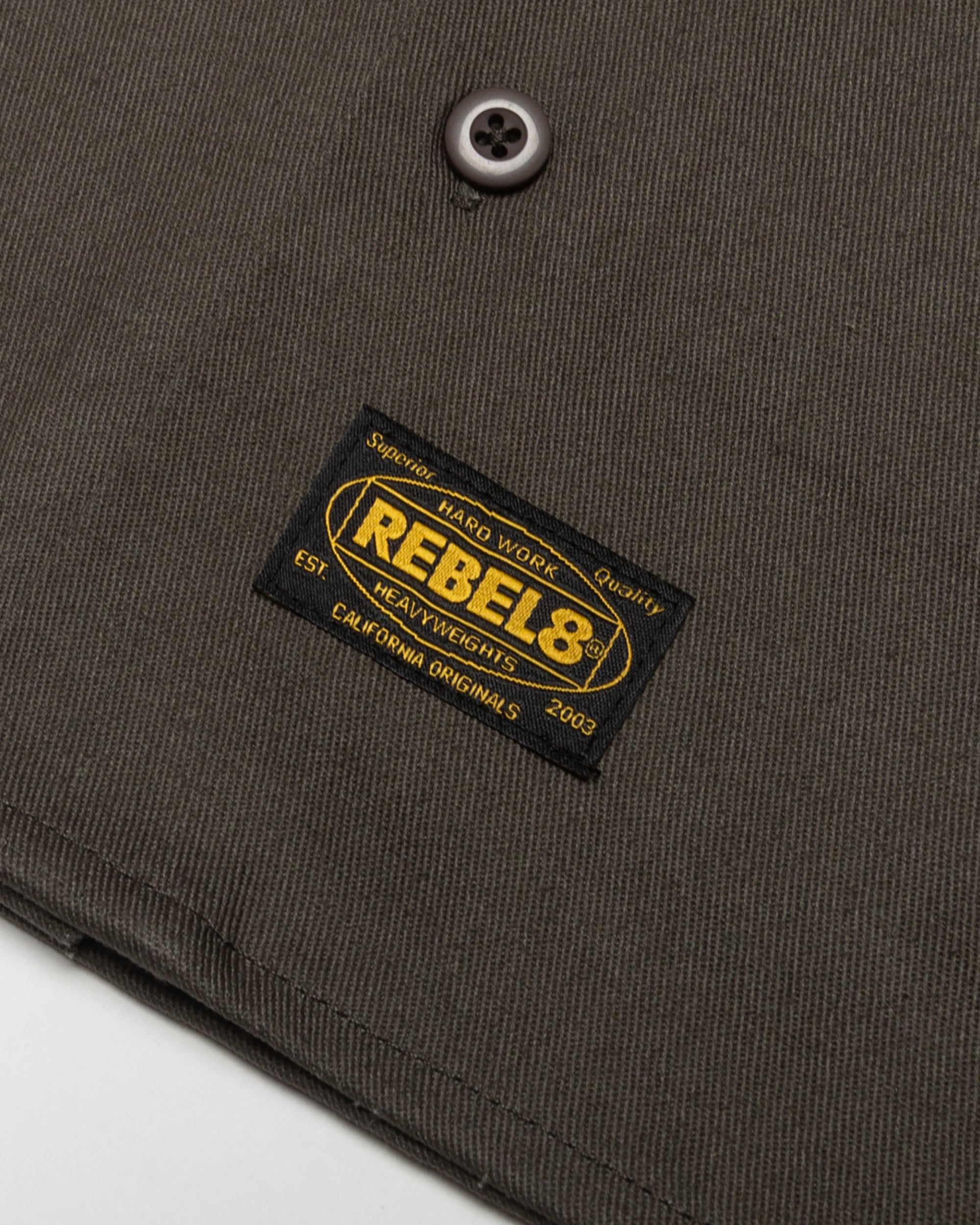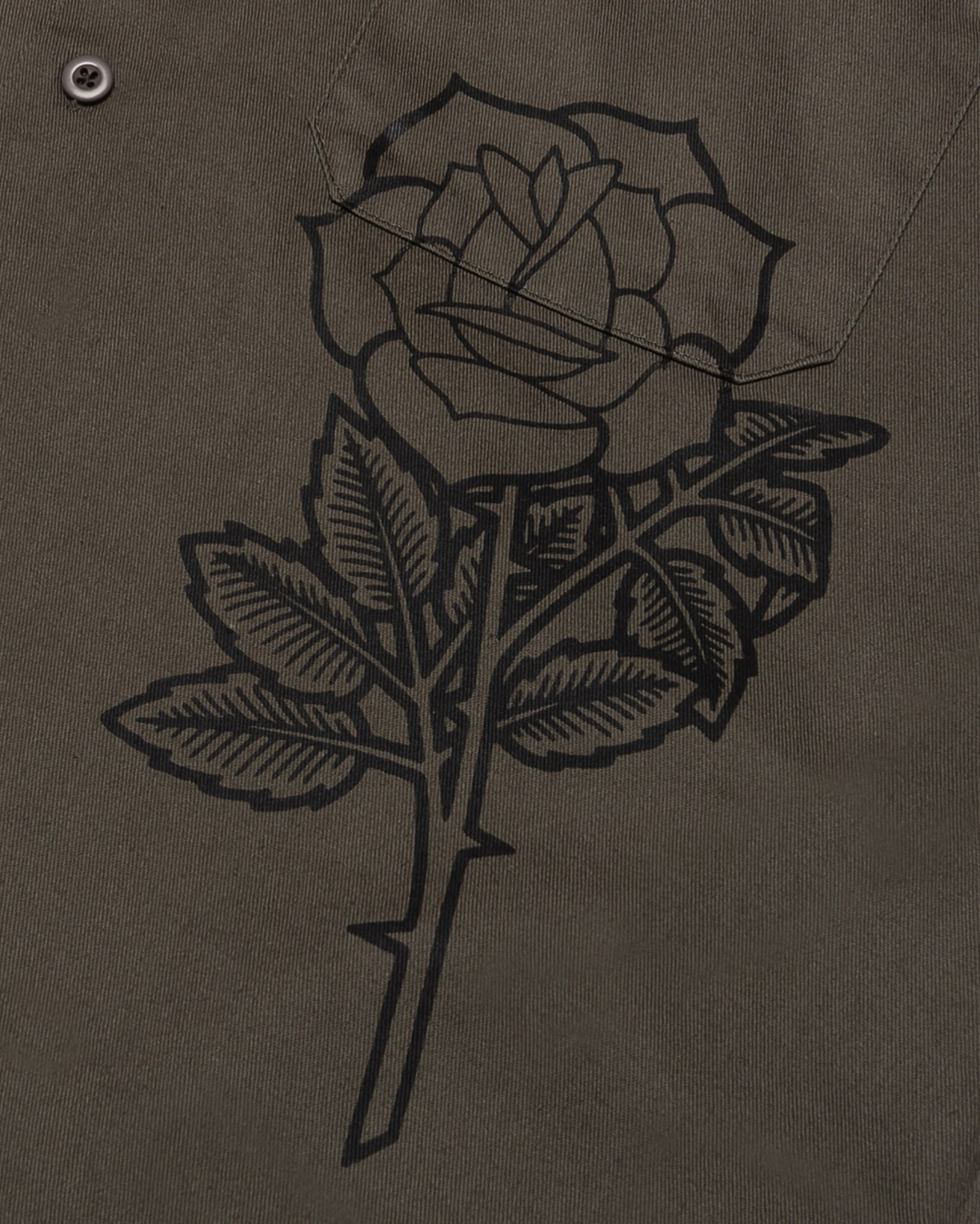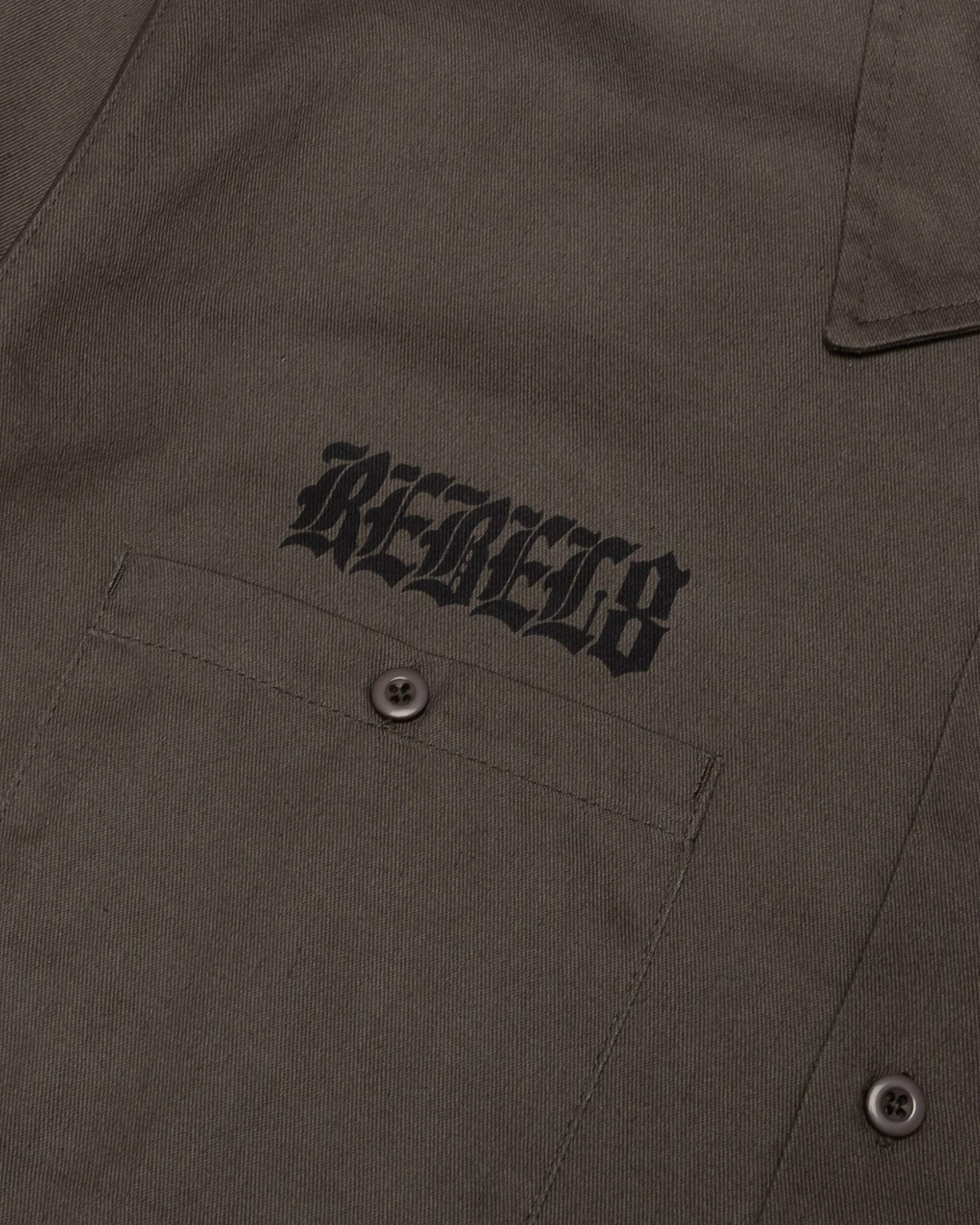 Regular fit work shirt with pockets. Tonal buttons. Printed art above right chest pocket, and over left chest pocket. Woven label at bottom front.